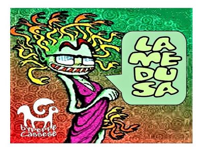 tenendo sulla testa una medusa. |